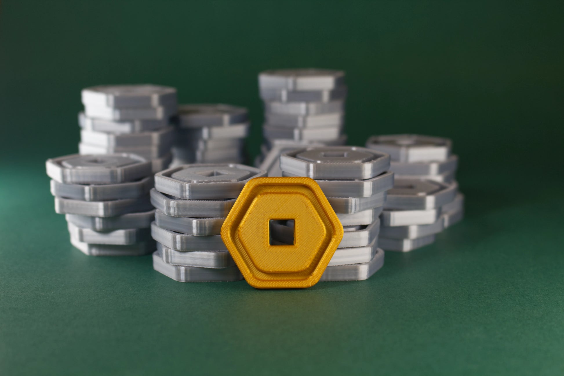 Introducing our 3D Printed Robux Tokens, crafted for fans of Roblox now in bulk! Each token is 3D printed using high-quality PLA plastic, ensuring durability and a smooth finish. The silk sheen gives these tokens a premium look, making them not just play items but keepsakes.